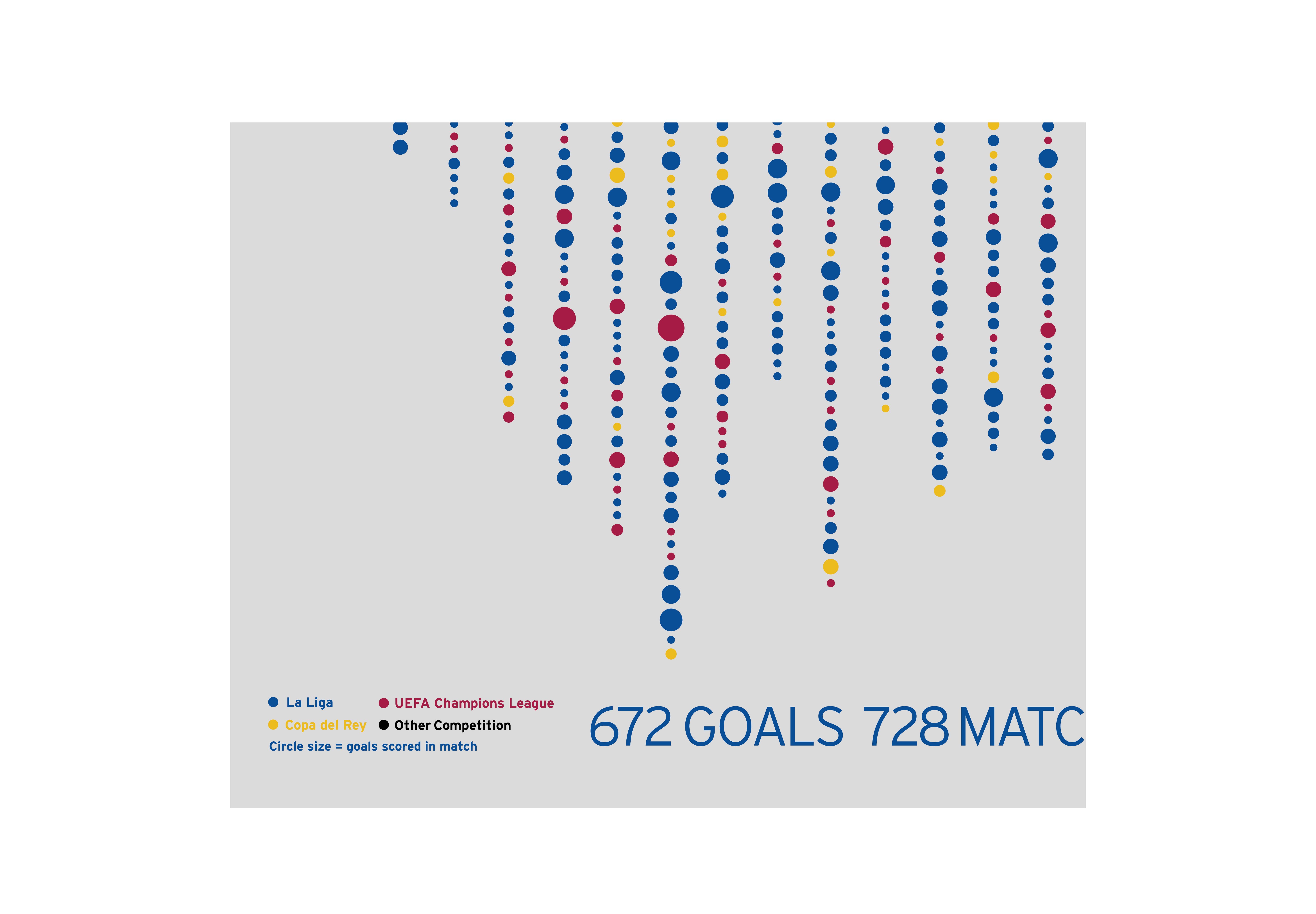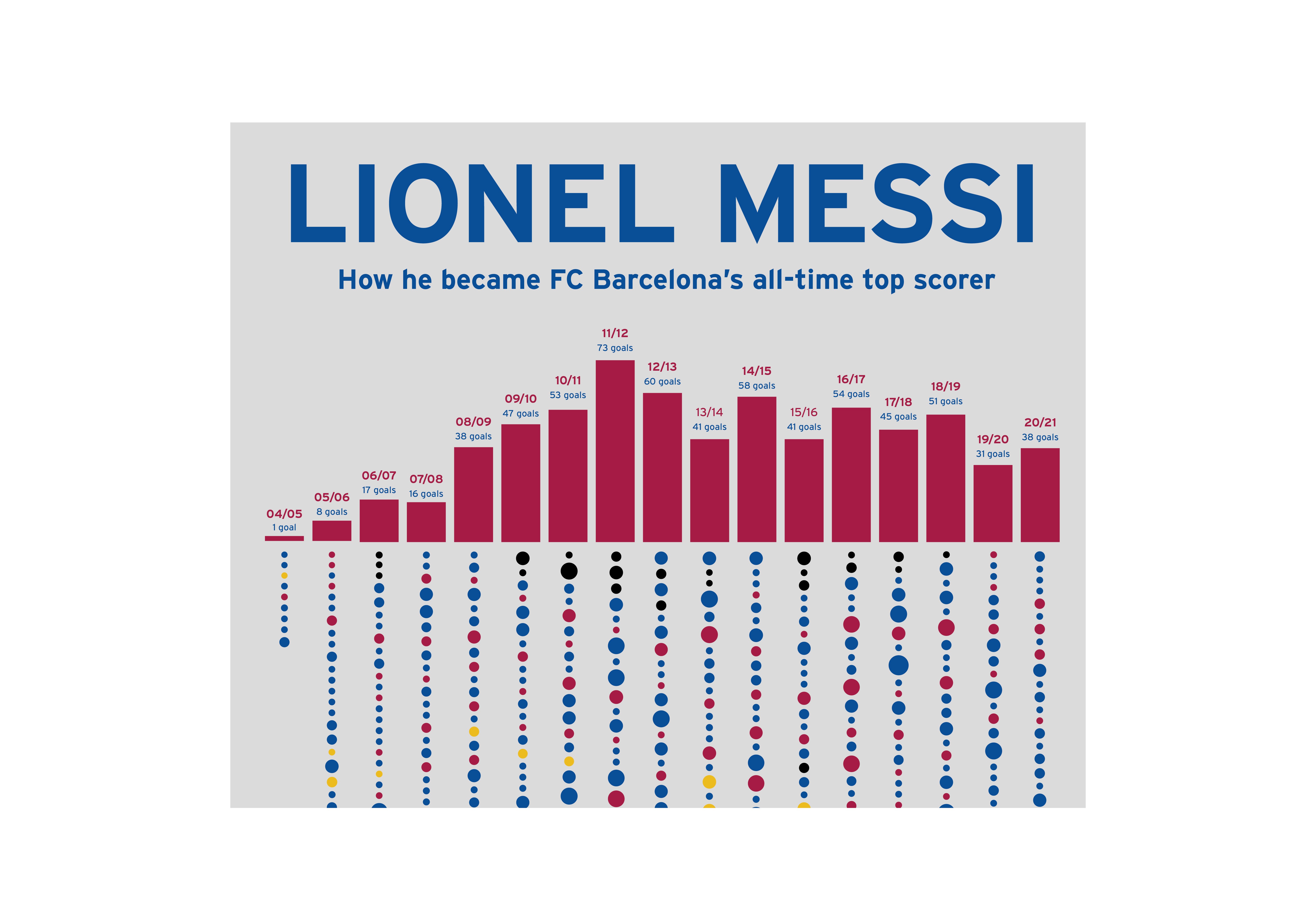 A visualization of Lionel Messi’s goal-scoring record at FC Barcelona with a bar graph showing total goals per season, paired with a corresponding dot-based timeline that maps his goals to individual matches. The dual system showcases both overall record and game-by-game performance.